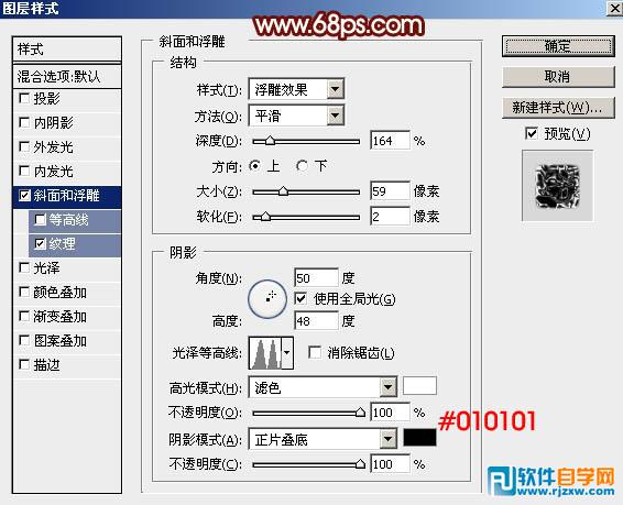 | 2、选择菜单:图层 > 图层样式 > 斜面和浮雕,参数设置如图3,设置好后再设置纹理。 |