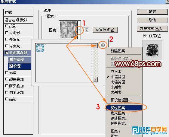 | 纹理中的图案选择PS自带的云彩图案。如果没有可以点击图案旁边的小三角形,再按照图5所示的过程选择“复位图案”。 |
