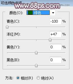2、创建可选颜色调整图层,对黄色,绿色进行调整,参数设置如图2,3,效果如图4。这一步把图片中的黄绿色转为橙黄色。