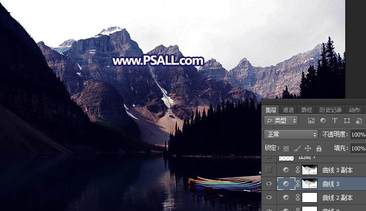 素材天空泛白,整体看上去有点空;前期直接把泛白的天空换上霞光素材;然后把图片整体压暗;再给天空渲染高光,水墨部分增加一些云雾,增加晨曦韵味。最终效果