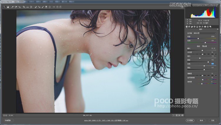 第一步:在PS中打开CR2格式的原图,通过Camera raw 对进行调整。首先是整体曝光稍微加一点,对比度加一点。由于远处水面太亮,故高光减少。阴影,白色,黑色细节提一下。清晰度和自然饱和度加一点。