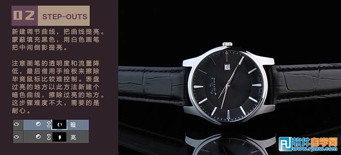 | 2、新建曲线调整图层,把曲线调亮,蒙版填充黑色,用白色画笔把中间倒影提亮。 注意画笔的透明度和流量降低。最后借用手绘板来擦除。毕竟鼠标比较难控制。表盘过亮的地方以此方法新建个暗色曲线,擦除过亮的地方,这步难度不大,需要的是耐心。 |