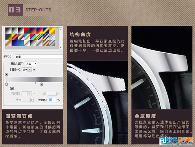 | 3、用钢笔抠出,平行渐变拉的时候要沿着表的结构弧度拉。抠图要干净,不要让蓝边出现。 |