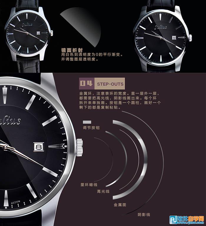 | 4、金属环:注意表环的宽度。里一层外一层,都需要把高光线,阴影线画出来。每个环拆开来单独画。按钮是一个圆柱,画好一个剩下的都是复制粘贴。 |