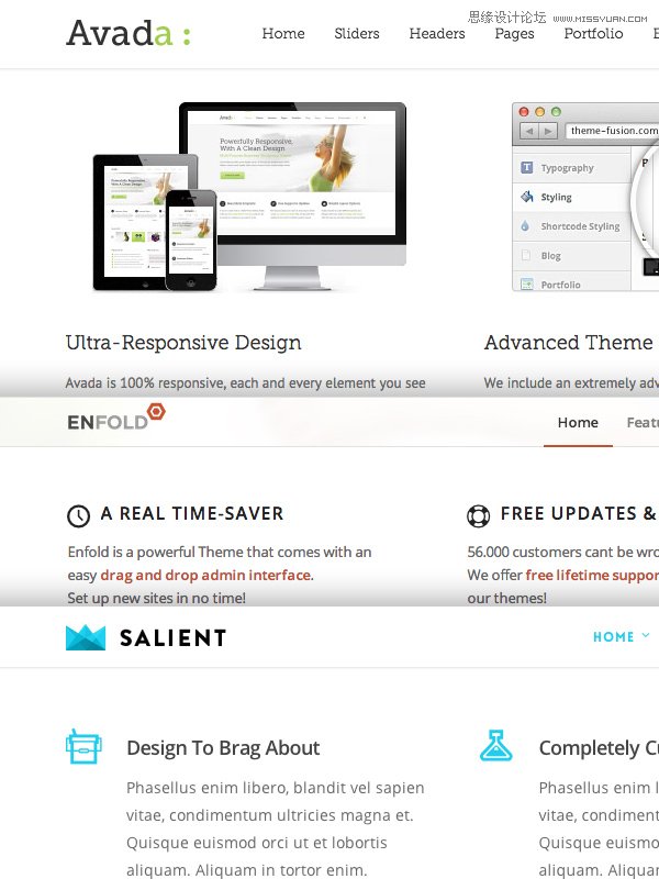 在真正开始研究Velositey之前,让我们先来简单温故一下常见的布局样式。以ThemeForest最受欢迎的三个Wordpress主题(Avada、Enfold和Salient)为例,你会发现它们有着许多共同点。