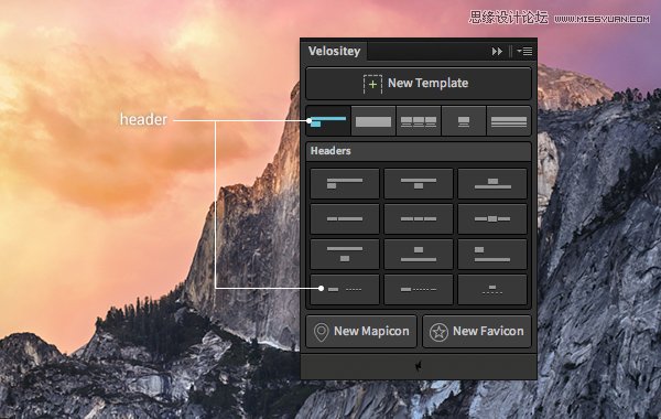 在“[+] New Template”按钮下方,你可以看到一系列选项卡,其中一个是Header。当我点击其中的一个的时候,Velositey会自动在文档中生成Header。