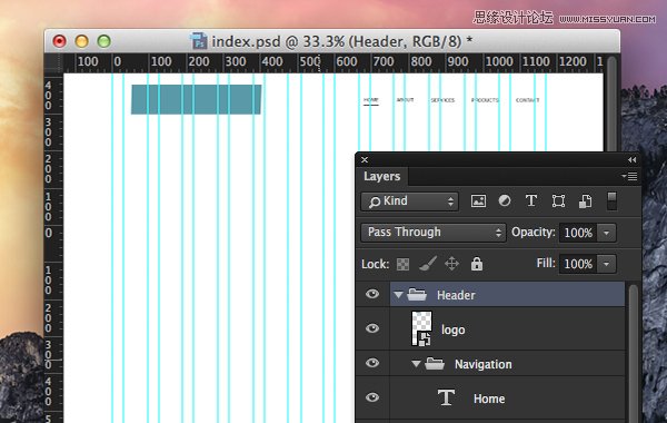 在这个案例中,我们使用的Header的样式是Logo在左,导航在右。在图层面板中,你可以看到Header中所有图层均置于文件夹中,你可以根据需求进行命名。