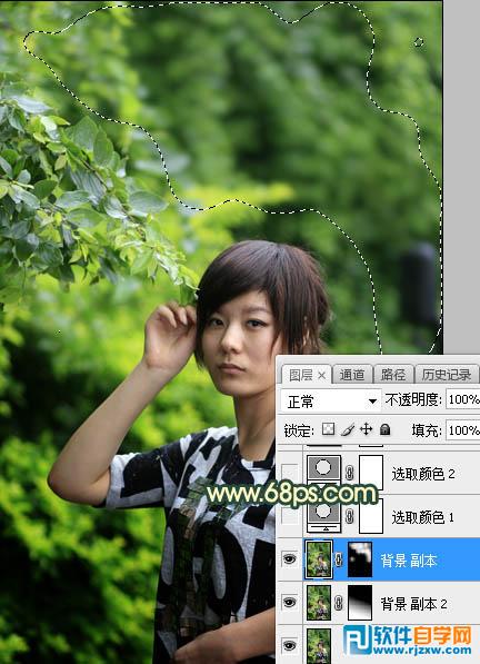 | 2、新建一个图层,按Ctrl + Alt + Shift + E 盖印图层,用模糊工具把下图选区部分的背景模糊处理。 |