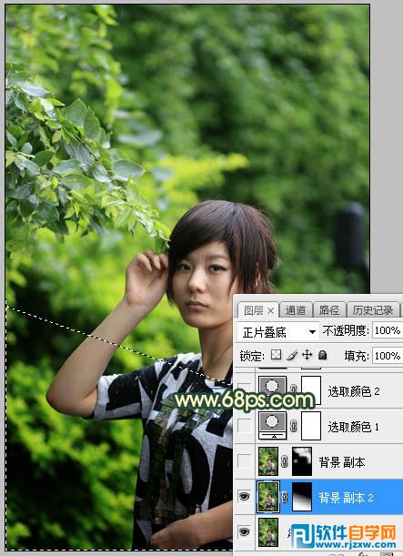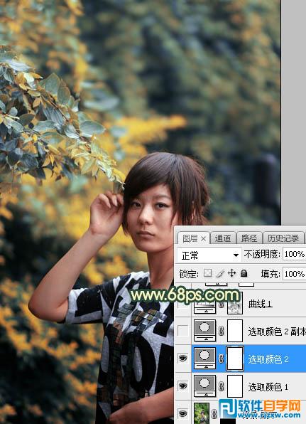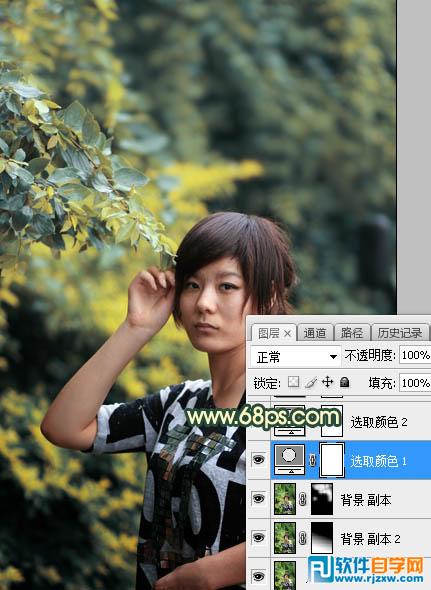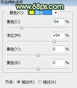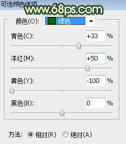 | 3、创建可选颜色调整图层,对黄色,绿色进行调整,参数及效果如下图。这一步把图片中的黄色转为橙黄色,绿色转为青绿色。 |