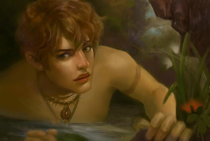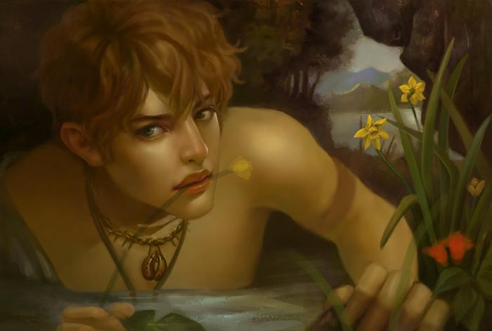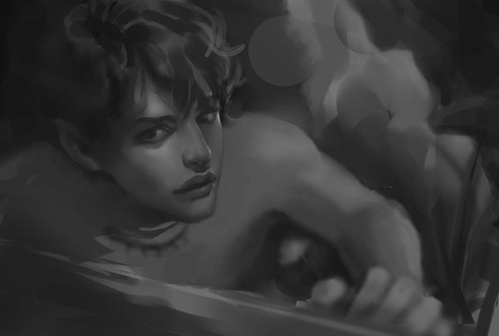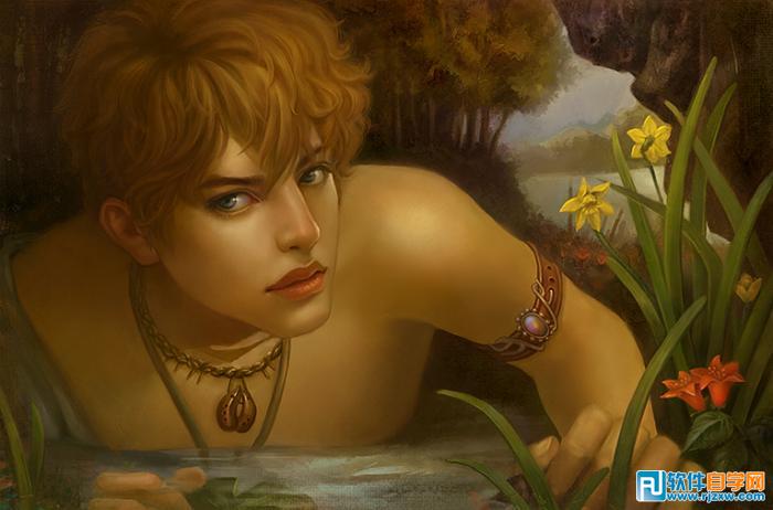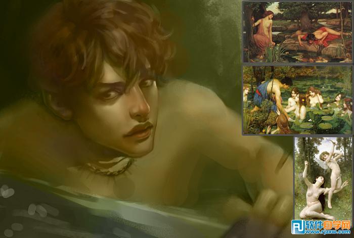 | 2、上图已经确定了大的黑白灰关系之后,以素描关系为依托,在Photoshop中新建并改变图层模式为“颜色图层”,给出画面中大的色彩基调,这样绘画的好处是,既保持了色彩的统一性也不必因为弄乱了素描关系而烦恼,一举两得且非常便利。在这里我参考了一些古典学院派的油画作品来拾取灵感,然后选择一些自己认为好的东西呈现到画面中去。 |