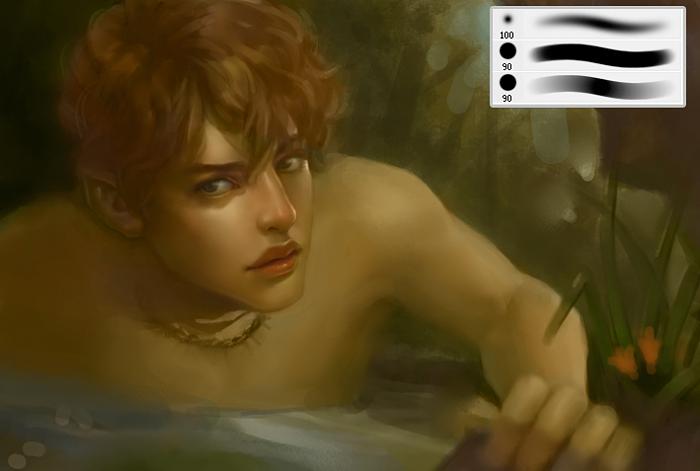 | 3、接下来选择Photoshop中的软笔刷与硬笔刷分别进行绘制。软笔刷用来刻画柔和的皮肤,硬笔刷更适合卡边,这样会让人物的边缘轮廓更加清晰。 小技巧:在使用Photoshop绘画中,若是想要画面看上去有透明感,那么就在每画一笔的时候,按下键盘上的Ctrl+Shift+F键,这样就可以比较直观的来控制画笔的透明变化,有点像古典油画的多层画法。 |