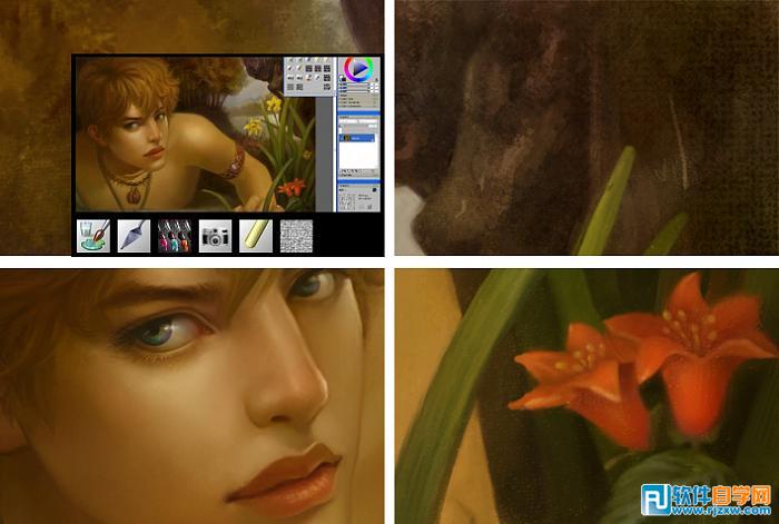 | 6、深入刻画的部分我是在Painter 11 里选用不同笔刷来绘画 。这个软件的好处是可以最大程度虚拟手绘的效果。我把以前搜集的纸纹纹理调用出来虚拟真实画布效果,上图是接近原尺寸的显示。 |