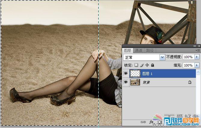 | 1、打开素材,新建图层。使用矩形选框工具在图片的1/2处框出选区(如下图所示)。 |