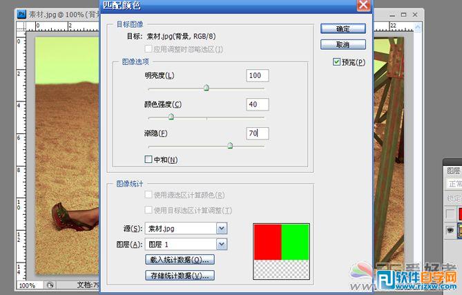 | 5、菜单栏“图像——调整——匹配颜色”,设置数值参考下图。 |
