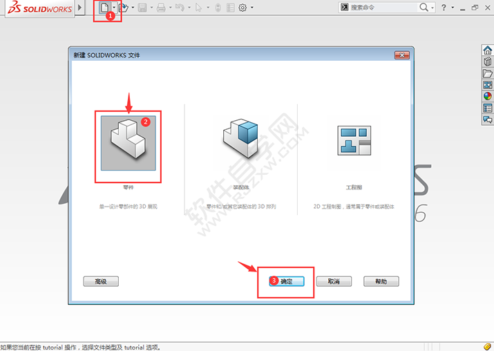 1、打开Solidworks软件,点击新建图标,点击零件图标,点击确定。