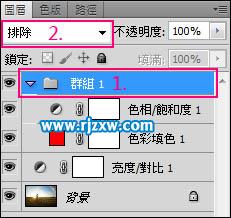 4、选择“群组1”之后,将“混合模式”选择“排除”。