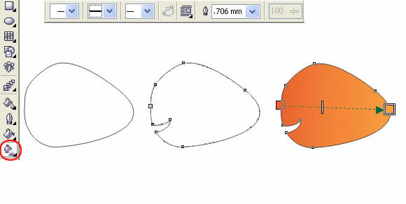 1、用贝塞尔工具画出小鱼的身体,选择工具栏中的交互式填充工具(快捷键为G),拉出一个渐变,颜色为从C:2 M:79 Y:81 K: 0到C:0 M:40 Y:80 K: 0。在属性栏中设轮廓宽度设0.706mm,颜色为黑。其他部位的轮廓也都用这个设置。