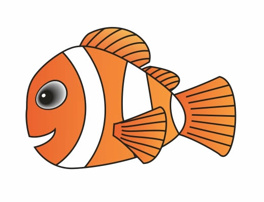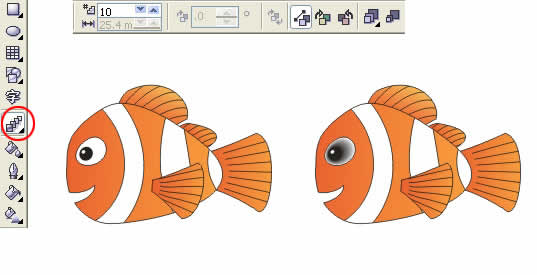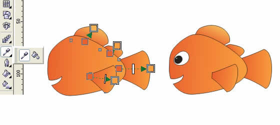 3、给鱼尾和鱼鳍填充渐变。用吸管工具点击鱼身吸取它的渐变效果,然后用颜料桶工具分别点击鱼尾和鱼鳍就能给它们填充同样的渐变。用交互式填充工具调节好渐变的方向。