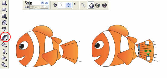 用贝塞尔工具分别画出两条直线,置于鱼尾之上如下位置,选择工具栏中的交互式调和工具,调和步数设为5,从一条直线上拖动到另一条,即可得到中间的线条。