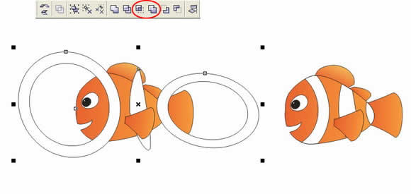 4、给鱼身添加花纹。鱼身的花纹由三部分组成,中间的那个直接用贝塞尔工具画,前后的两个做法相同,即:先用椭圆工具画出一大一小两个椭圆,居中对齐后点击属性栏中的简化按钮,形成一个圆环,调整一下形状后填充白色。将三个花纹选中,ctrl+G群组后按住Shift键将鱼身也一起选中,点击属性栏中的相交按钮得到相交部分后将原花纹删除。