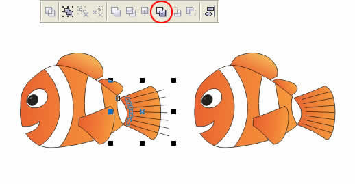 6、选中所有直线和鱼尾,点击属性栏中的简化按钮即可得到相交部分,将原直线删除,完成鱼尾。重复第5、6步分别做出几个鱼鳍上的花纹,完成鱼鳍。
