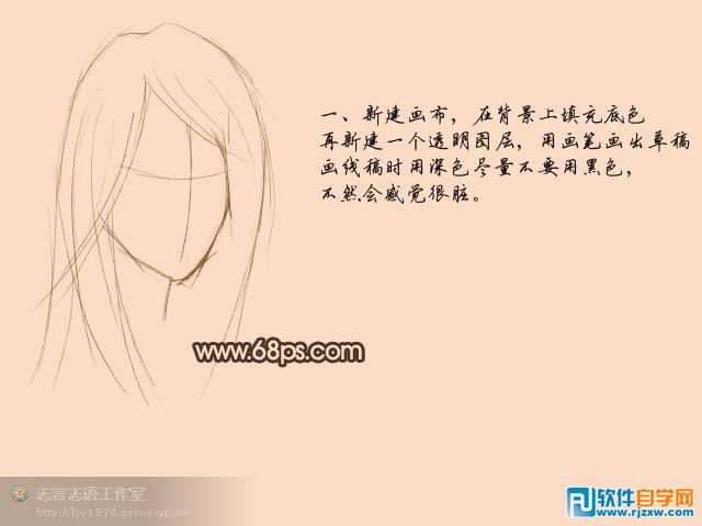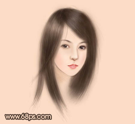 | 2、新建一个图层,用柔边画笔涂出头发的底色。记住留出高光,过渡部分要柔和一些,缩小观察下效果。不要画得太死。 |
