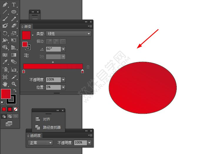1、打开AI软件,点击椭圆工具,绘制一个椭圆出来,填充红色渐变效果出来。