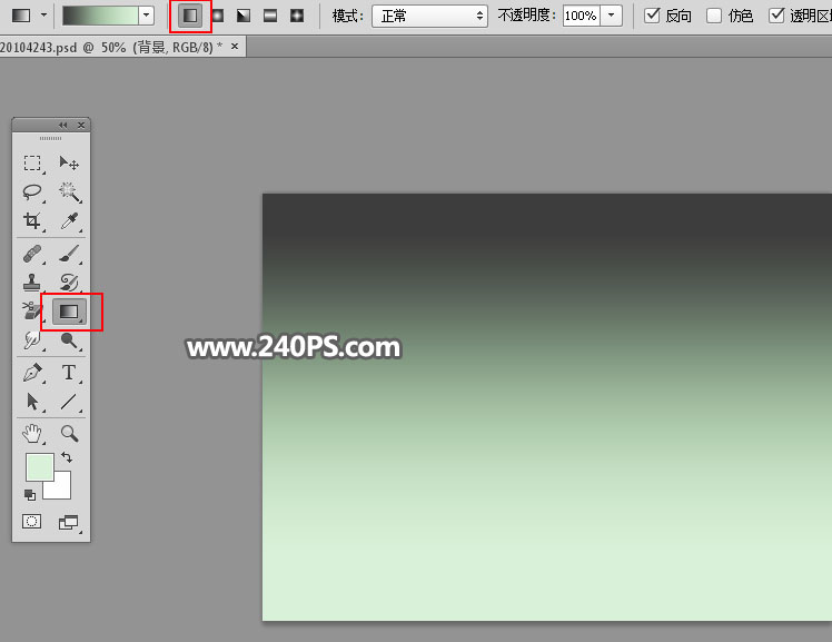 3、在属性栏选择“线性渐变”,然后由上至下拉出下图所示的渐变作为背景。