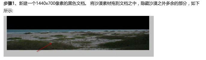 一、新建一个1440 * 700像素的黑色文档。将沙漠素材拖到文档中,隐藏沙漠之外多余的部分,如下所示。
