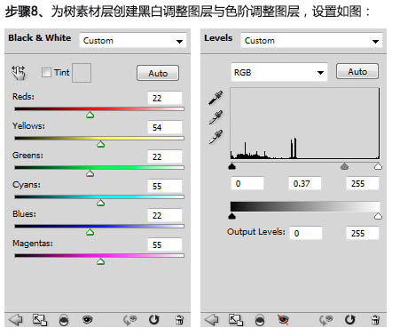 八、为树素材层创建黑白调整层与色阶调整图层,设置如下图。