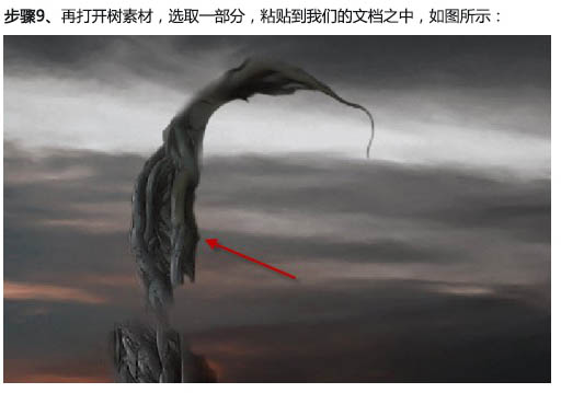 十、我们为图像增加一些粒子效果,打开树素材,用选取工具选取一些小块树的纹理,并粘贴到我们的文档中来。