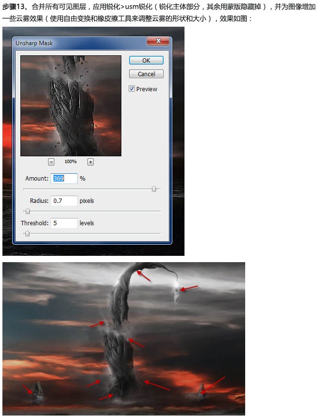 十三、合并所有可见图层,选择:滤镜 > 锐化 > USM锐化,并为图像增加一些云雾效果。