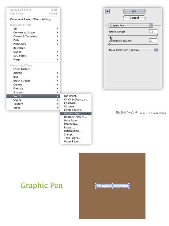 选中小矩形,使用 效果-素描-绘图笔。当对话框弹出时,设置以下选项。