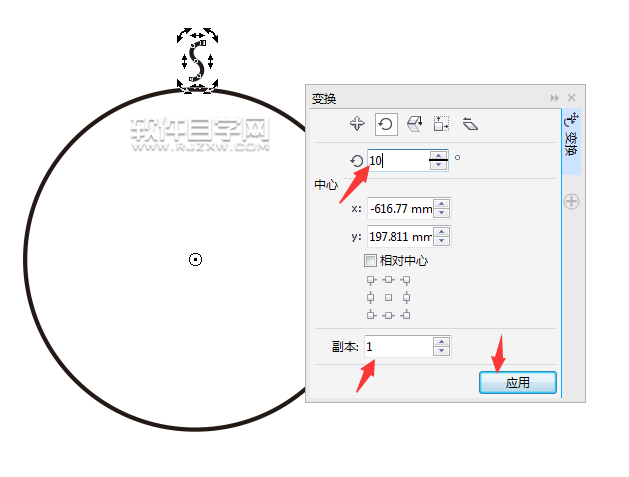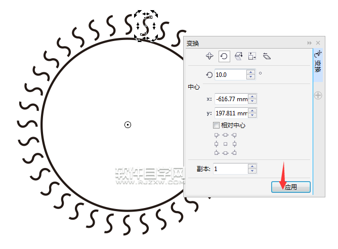 第5步、然后按Alt+F8进入变形的旋转模式,设置旋转角度,还有副本,点击应用。设置如下: