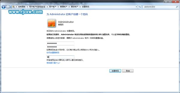 2、在控制面板中打开“用户帐号”,将Administrator修改密码,尽量复杂些,不一定要记得。再创建一个计算机管理员用户和受限用户,管理员用户一定要密码,且也要复杂一些,这个密码要记住。因为以后装软件,游戏要用上。当然,记不住可以在DOS下改。