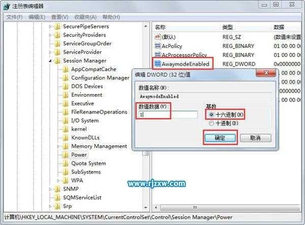 3、在右侧窗口空白处单击鼠标右键,新建一个“DWORD32位”的值,并命名为“AwayModeEnabled”,双击给该键值,并赋值为“1”(16进制);