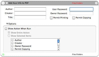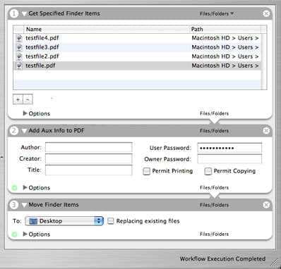 10、该工作流用密码保护选定的PDF文件,并且把这些文件移到你指定的位置。在这个过程中我遇到的唯一阻碍就是,使用Automator 控件的话你就无法指定输出文件的名称。如果你认为通过使能“移动搜索项目”中的“替代现有文件”确认框来解决这个问题,那你就错了;这是只是一个移动控件。输出文件的名字是随机的,比如pdfauxinfo.k365vaq6.pdf。很有可能存在一种Automator控件,而它可以获得文件的名字并修改之,但是我并没用使用它。