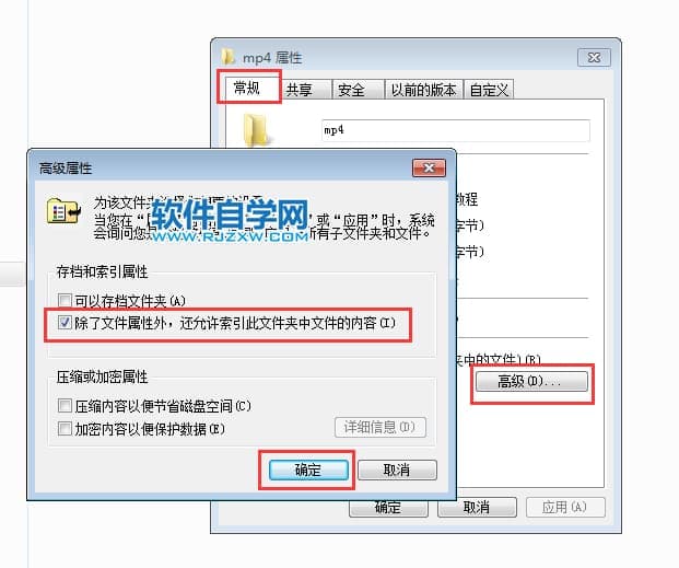 6、对于文件夹,切换到“常规”选项卡,点击“高级”按钮,在“高级属性”中,勾选“除了文件属性外,允许索引此文件夹中文件的内容”。