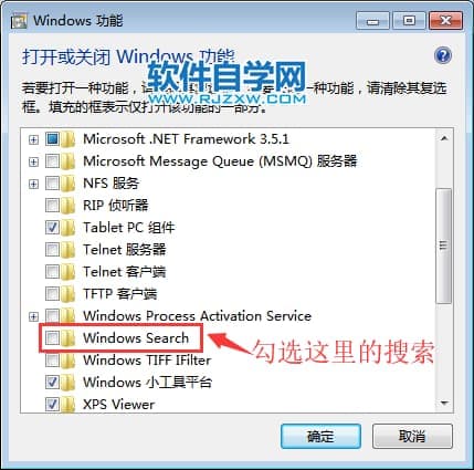 第4步、然后再在Windows Search前面打勾,点击确定。