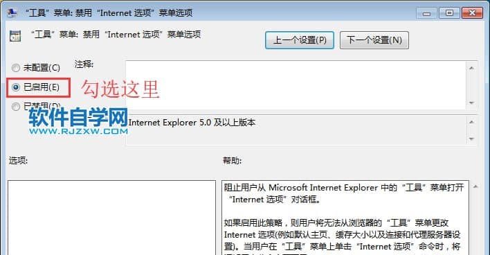 第3步、进入工具菜单:禁用“Internet”选项“菜单选项面板,勾选已启用。点击确定。就好了。