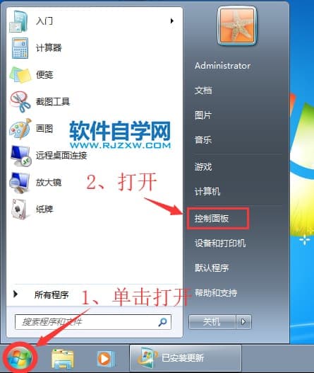 第1步、打开电脑,点击左下角的开始菜单,点击控制面板。