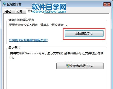 第3步、然后进入区域和语言面板,点击更改键盘。效果如下: