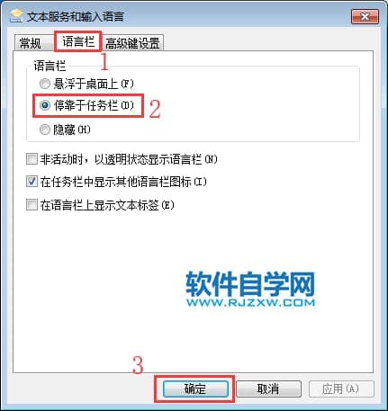 第4步、然后进入文本服务和输入语言,选中语言栏,勾选停靠于任务栏。点击确定。