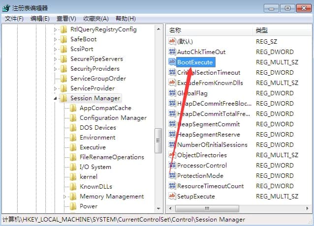 第2步、然后进入注册表编辑器面板,在左侧菜单栏中依次点击展开HKEY_LOCAL_MACHINESystemCurrentControlSetControlSession Manager,在右侧的窗口中看到很多选项了,咱们找到其中的BootExecute选项并双击打开。