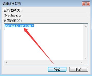 第3步、然后进入编辑多字符串面板,然后把autocheck autochk删除掉。点击确定就好了。