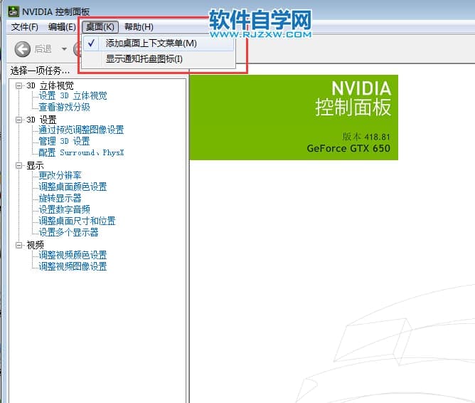 第3步、进入NVIDIA控制面板,点击桌面菜单,把添加桌面上下文菜单与显示通知托盘图标都勾选上。效果如下: