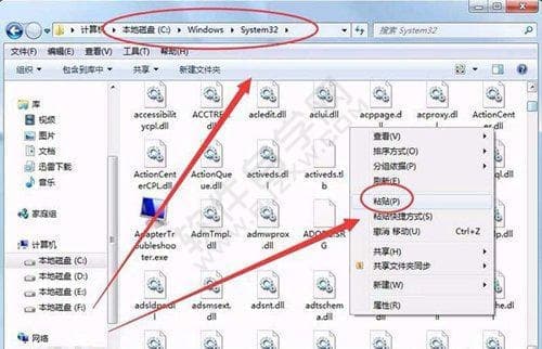 3、System32文件夹上右击,选择粘贴,将quartz.dll文件复制到System32文件夹中。