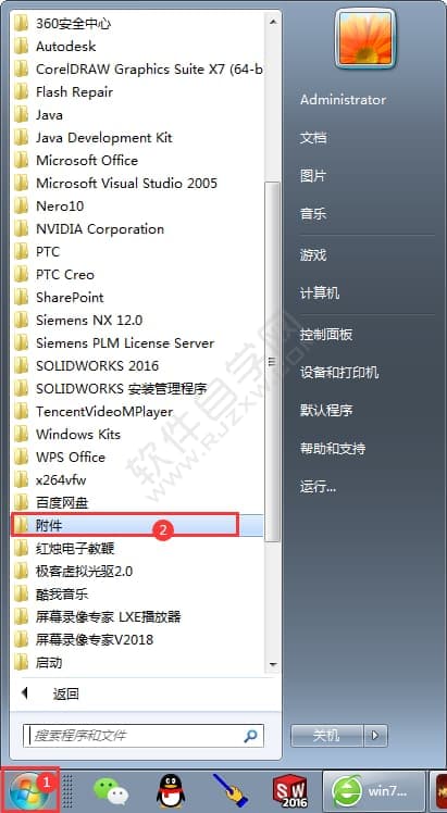1、点击左下角的开始菜单,点击附件功能,效果如下: