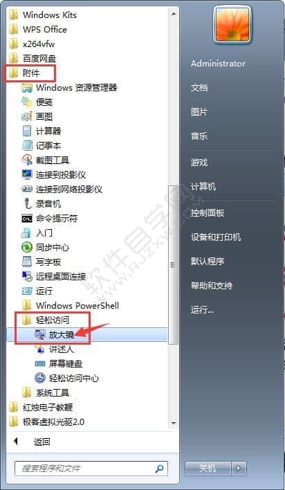 2、点击附件菜单里面的轻松访问,点击放大镜。