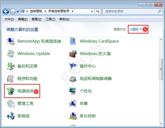 2、在控制面板中,查看方式为大图标,点击电源选项。